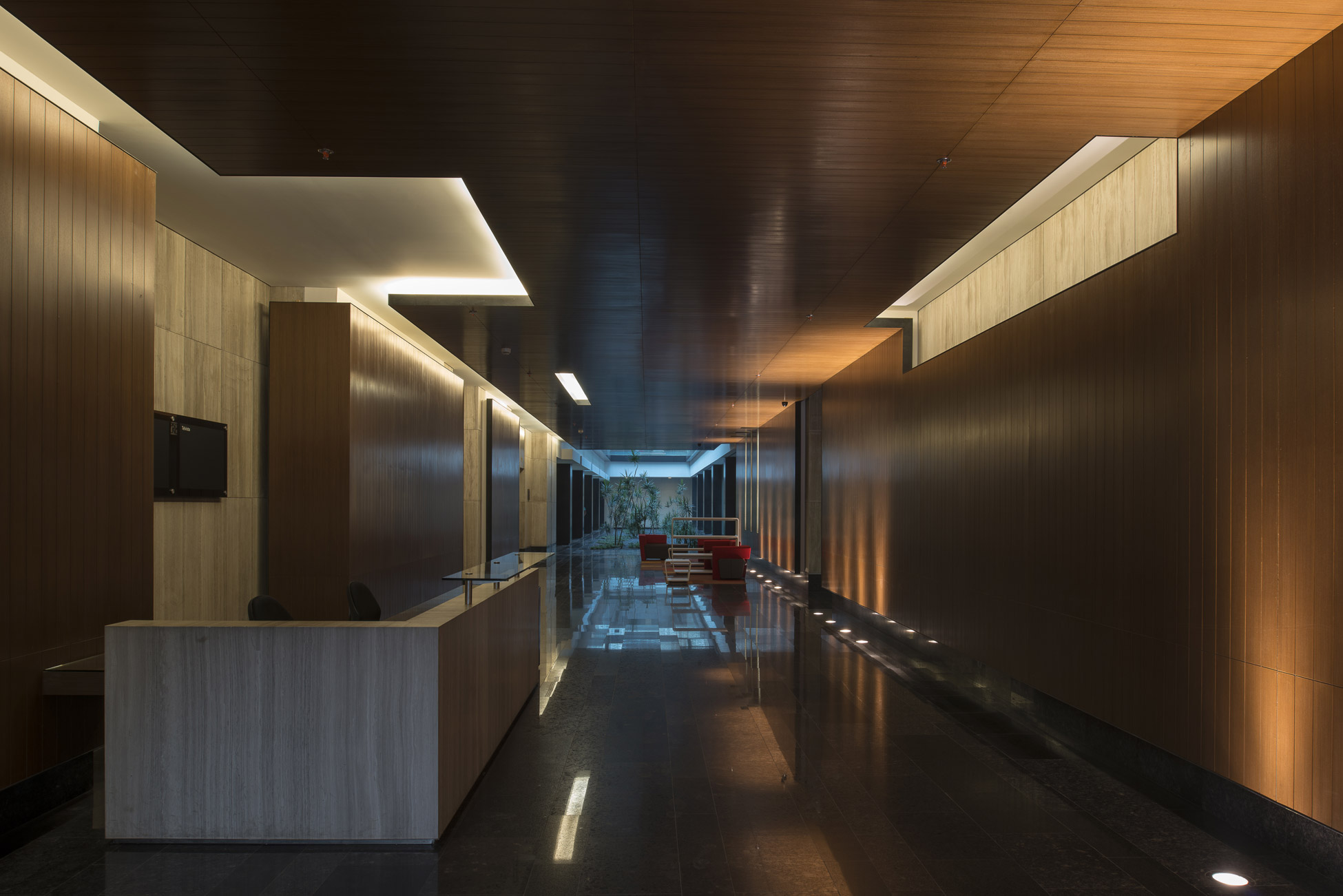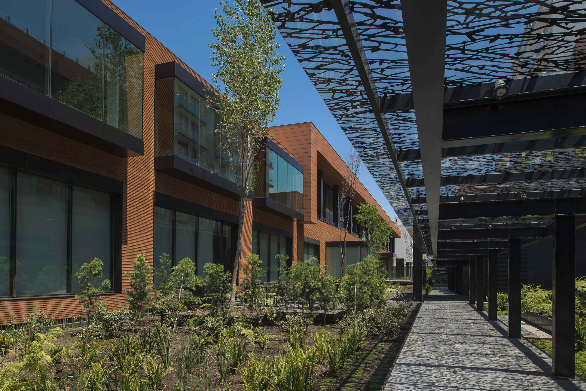 The warmth and the natural state of the materials used, ceramic and red brick, blend in harmoniously with the residential area making a smooth transition into a corporate style.