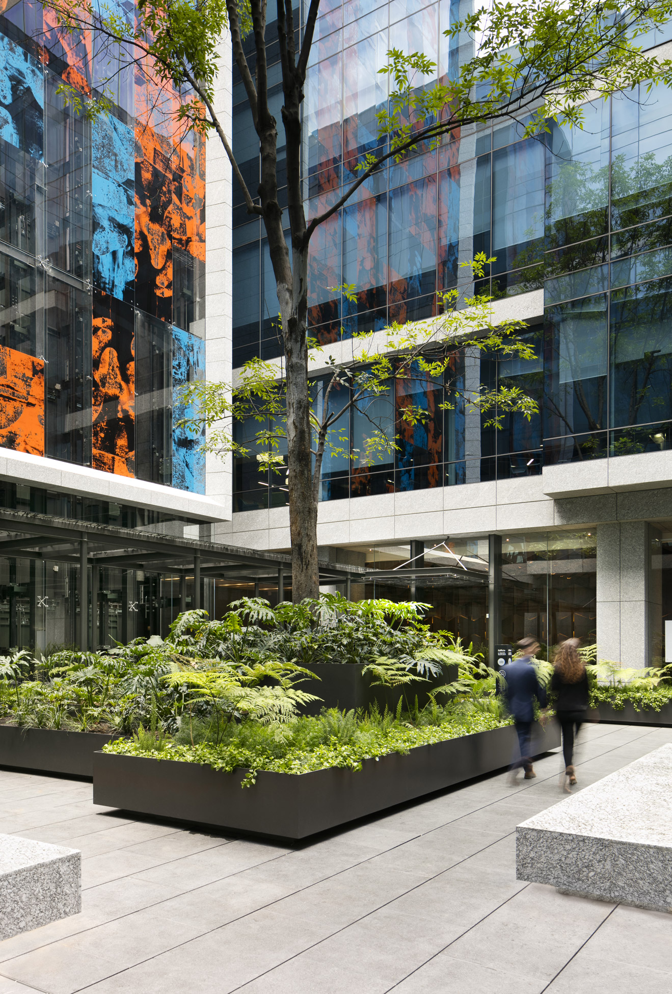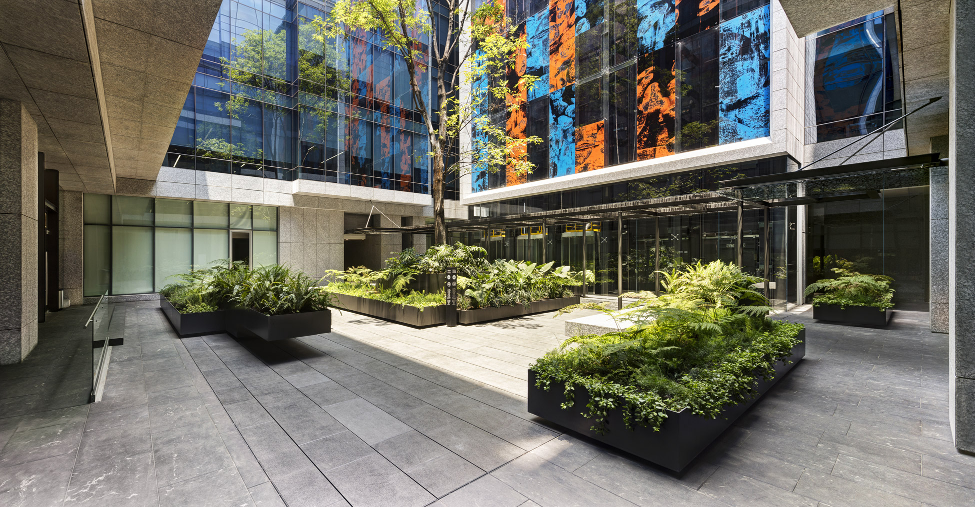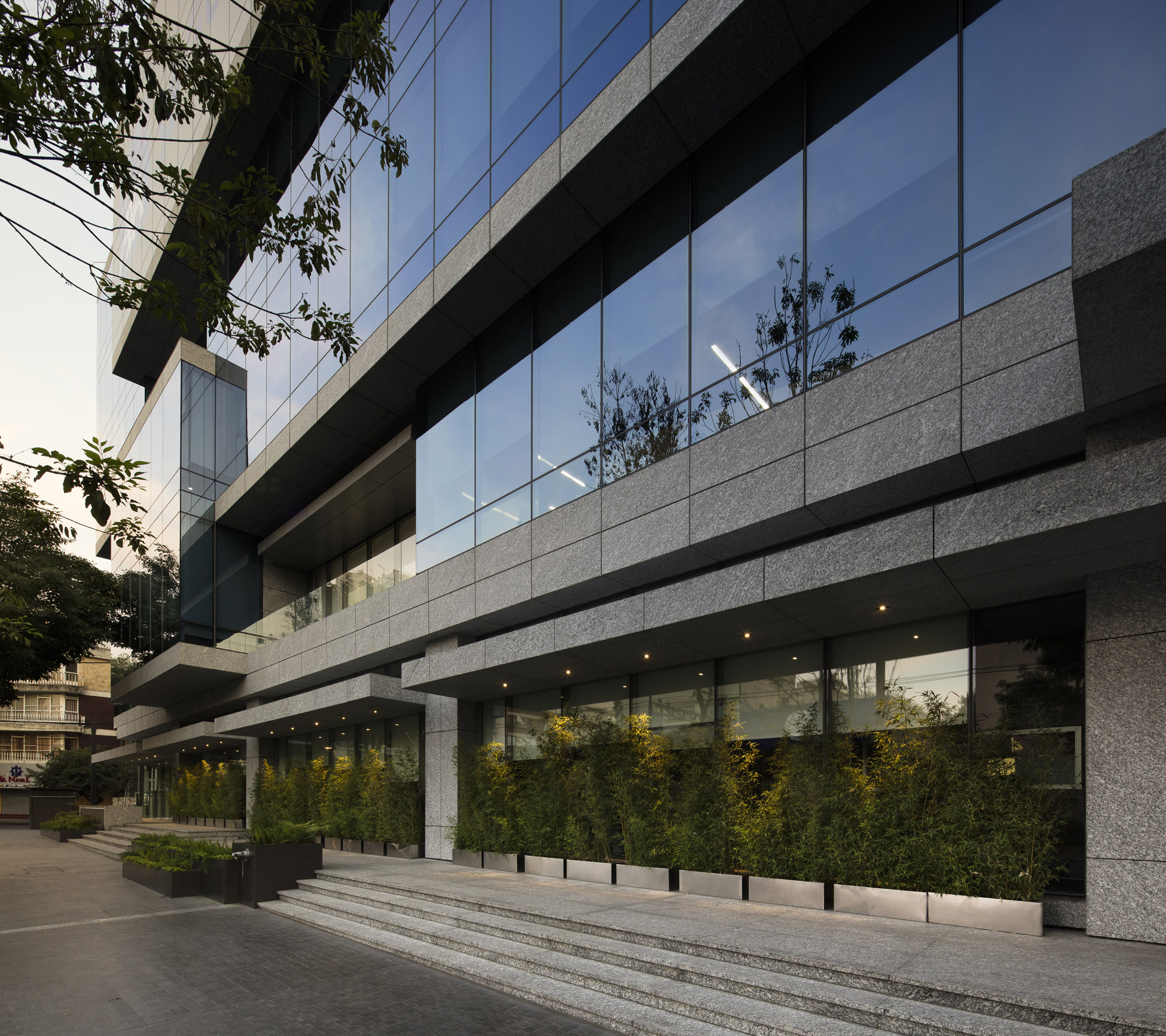 Two light-filled patios were sculpted in the center of the building, one of them being public. Both of them have exuberant gardens and recreational areas for its users and visitors. The main elevators are panoramic and are made of a screen-printed glass panel made by Opioptico artists, which allows to glimpse into the inner patio.