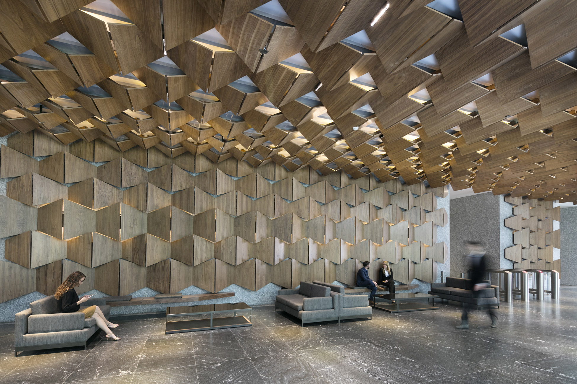 The main lobby was taken over by Héctor Esrawe, wrapping the space with a wooden lattice that sustains the concept of human scale fragmentation alluding to a kind of still life, allowing the exterior, the interior and the public patio to come together.
