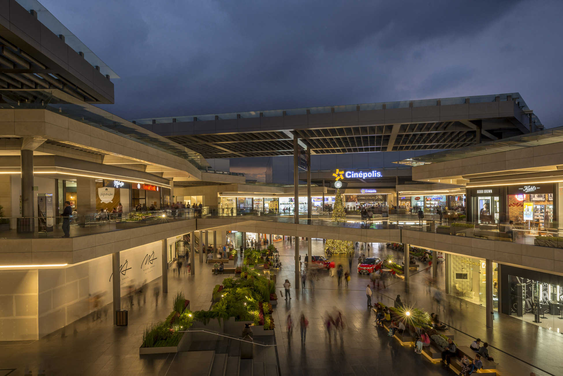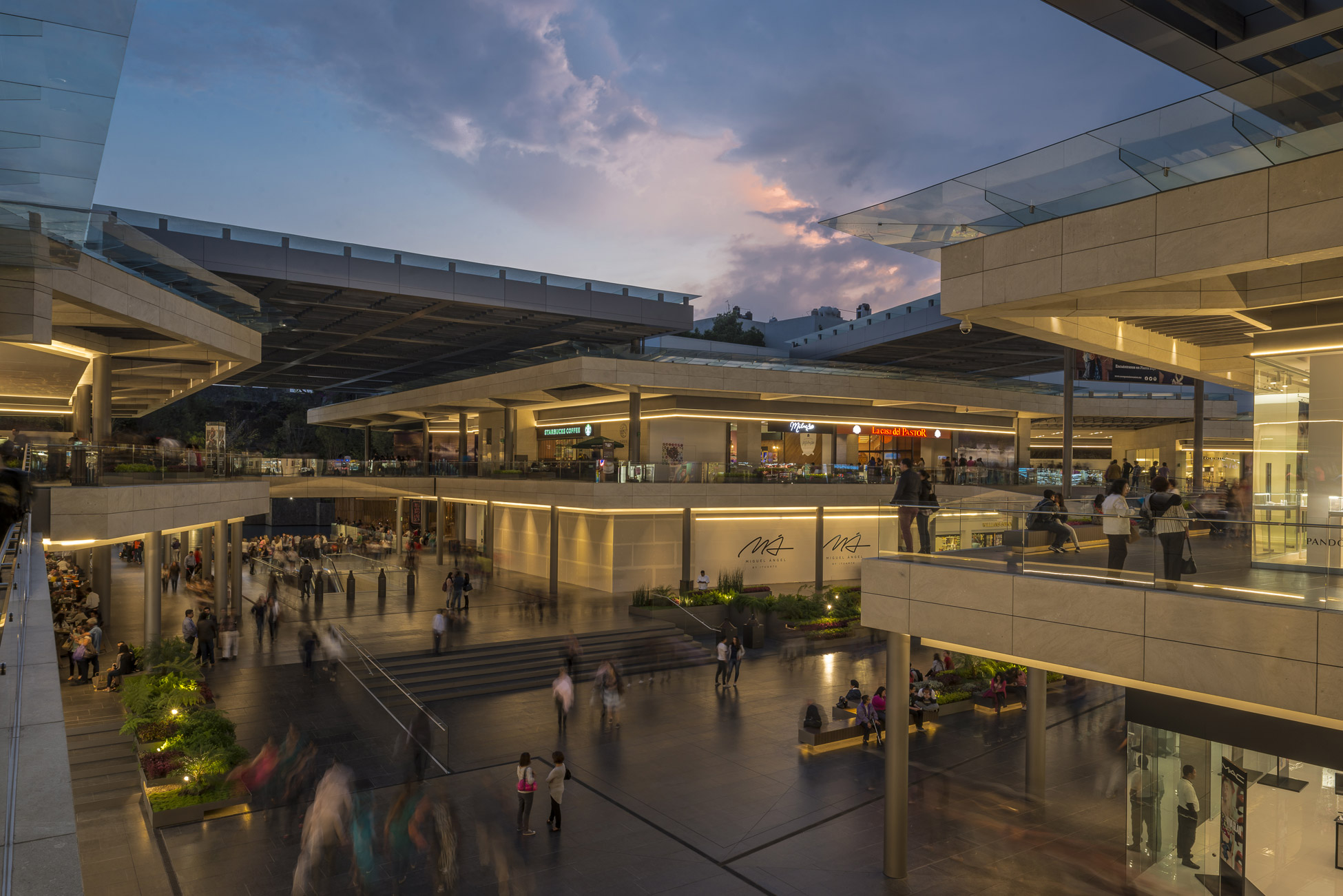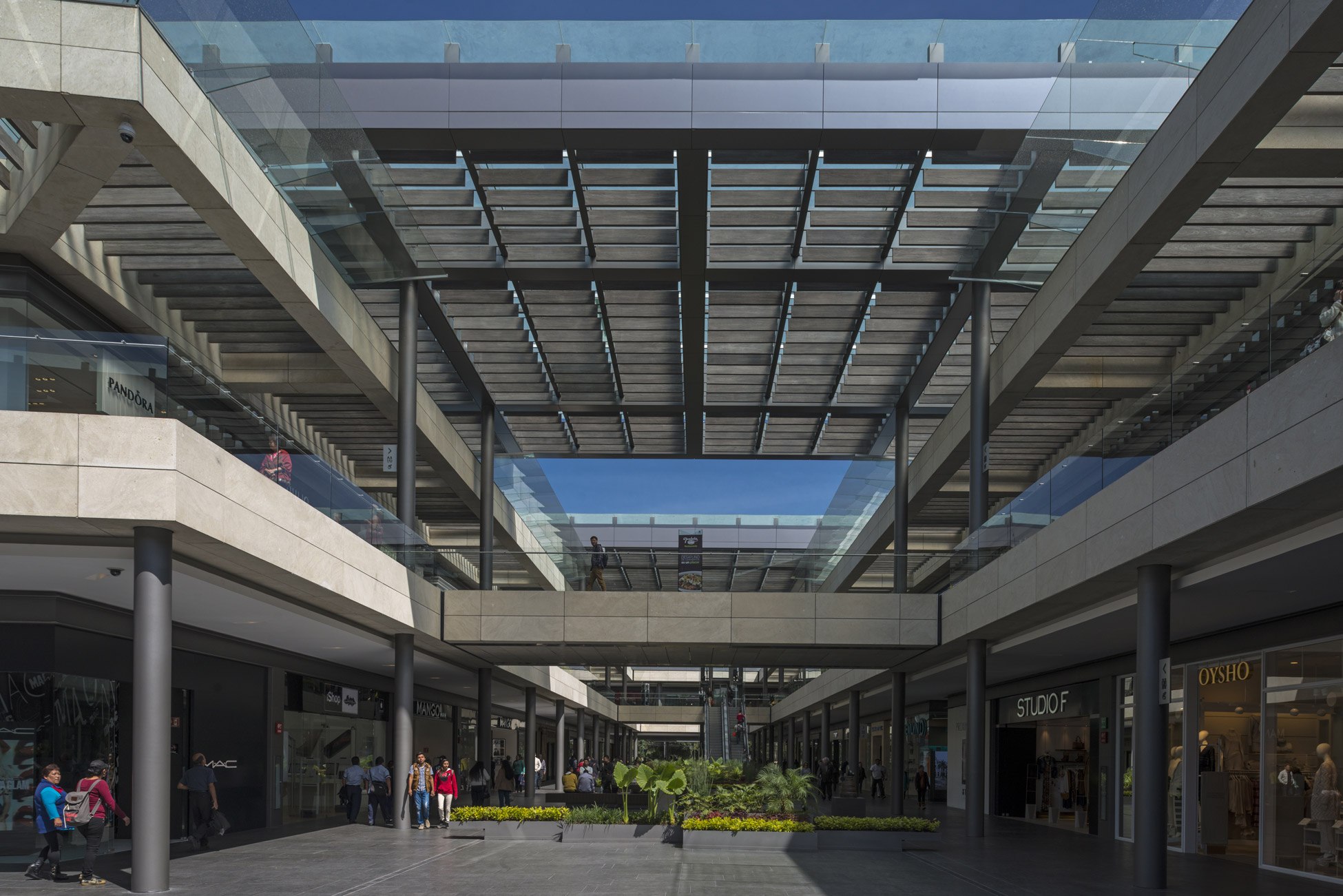 The public plaza is located on the western side before the lake. Wide and open, it is designed for multiple activities; concerts, readings, artistic events or simply to enjoy. The greatest challenge was to establish the nature and the identity of the commercial center on the client’s condition that 100% of the frontal sides were shop windows and that no visual obstacles were displayed (including vertical plants). The canvas upon which we worked consisted on ceilings and floors. The floor was conceived as a continuous garden.