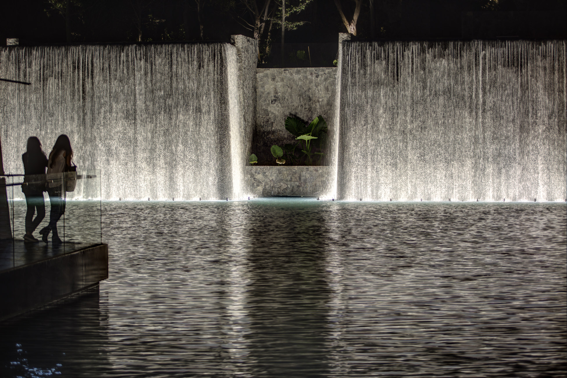 Inside the lake, three water walls and 50 choreographed water jets create a water spectacle of light and music for its visitors.