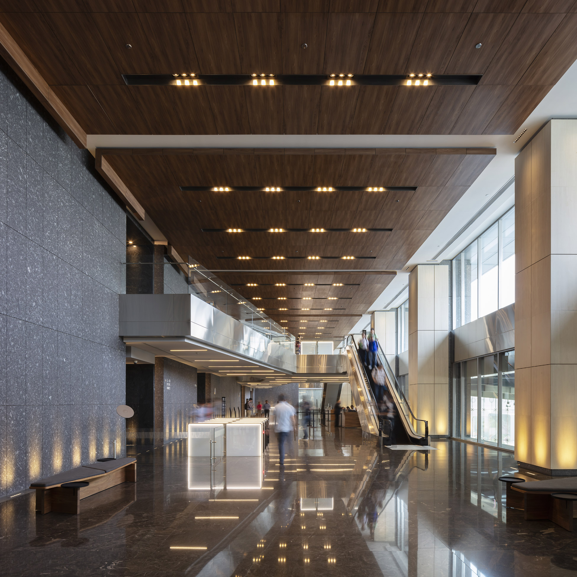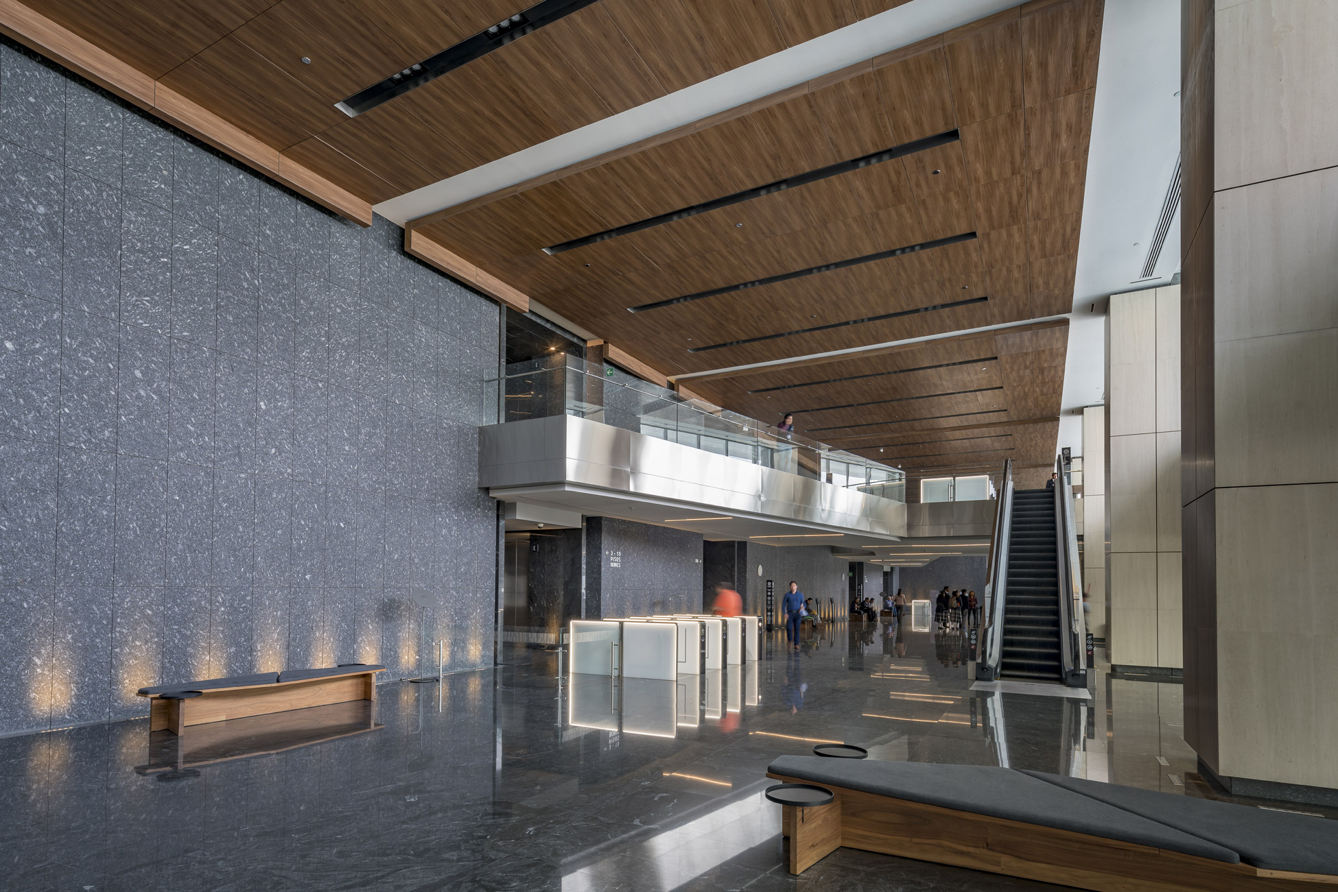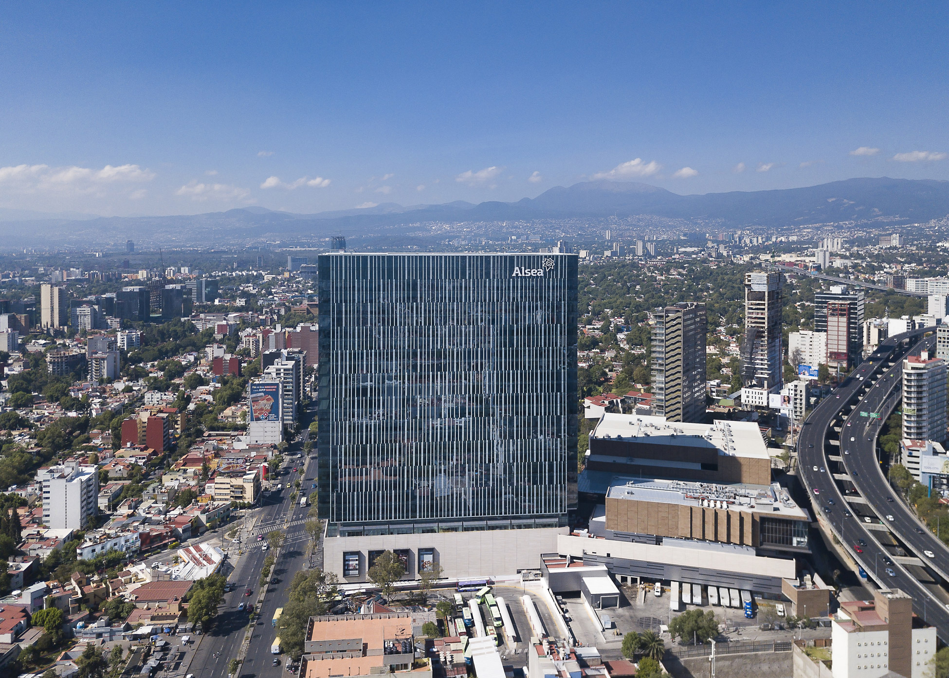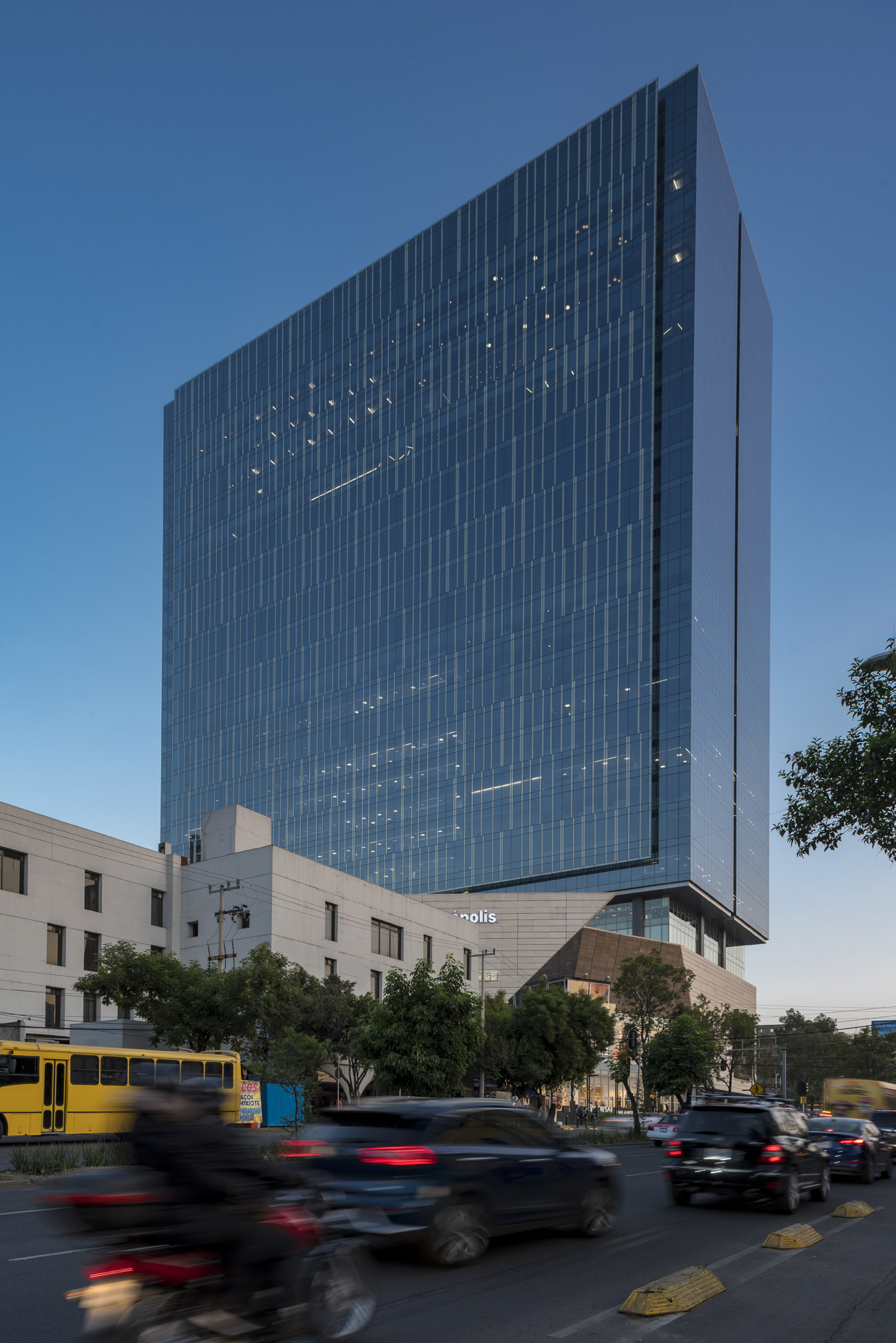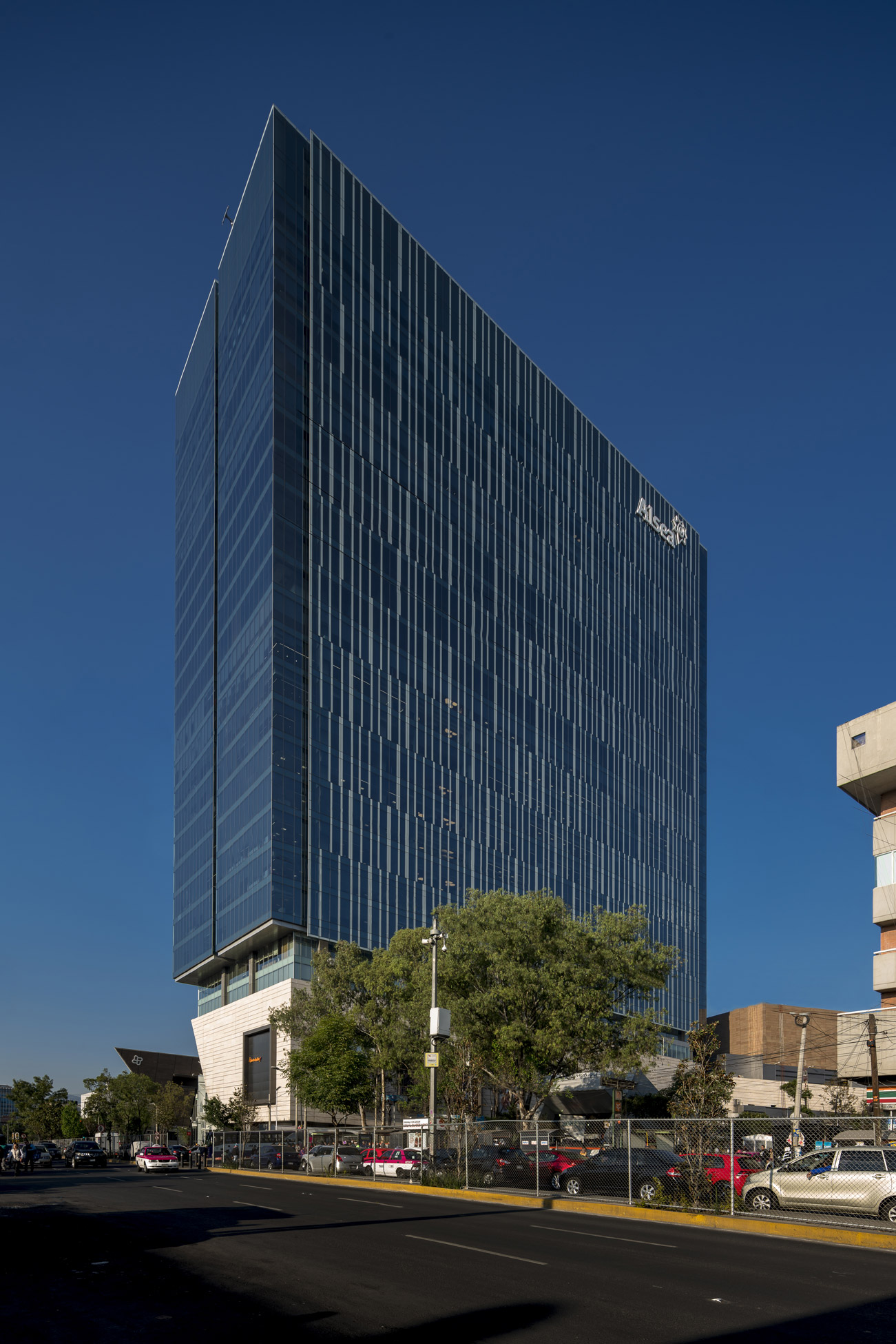 As background information, the client requested to insert an 80,000m2 tower within a commercial center designed by another architect firm. The tower is located in the southern part of the city and is composed of spacious and profitable installations of almost 4,000m2 suitable for high-level corporate spaces. The idea was to use the available density of the terrain to create a synergy between the commercial center and the offices. The commercial center provides services to improve the user’s quality of life and the offices give life to multiple commercial premises during the week.