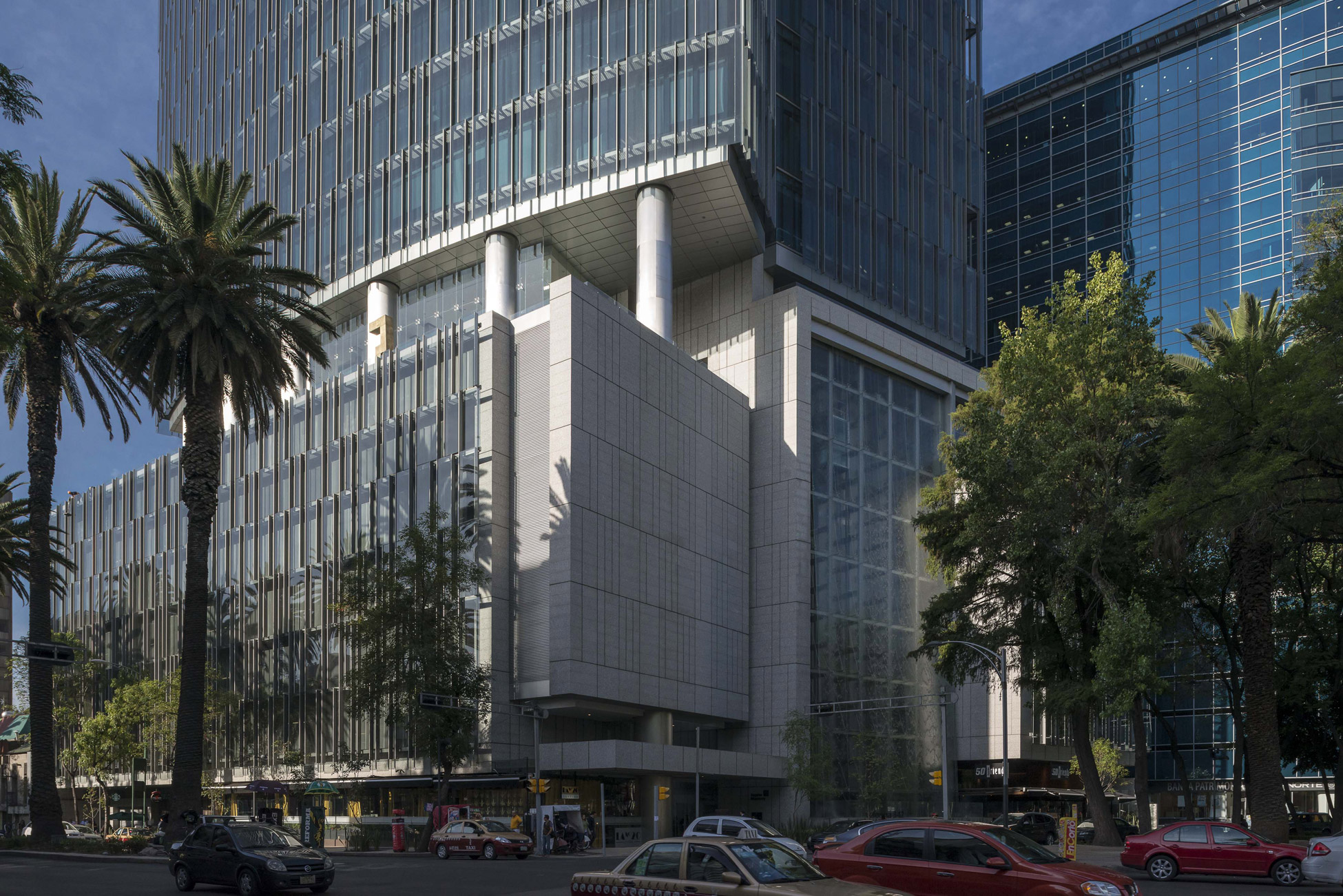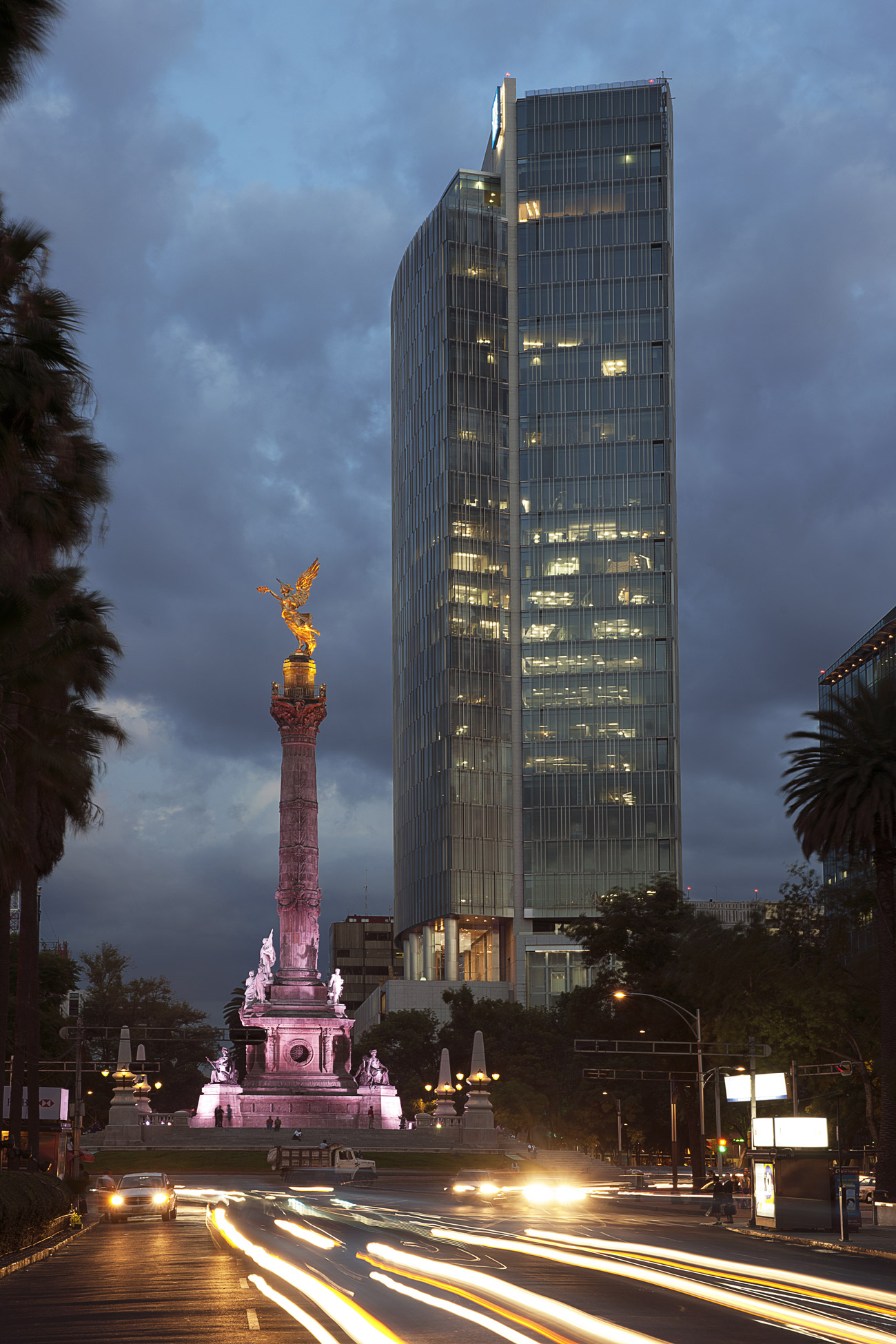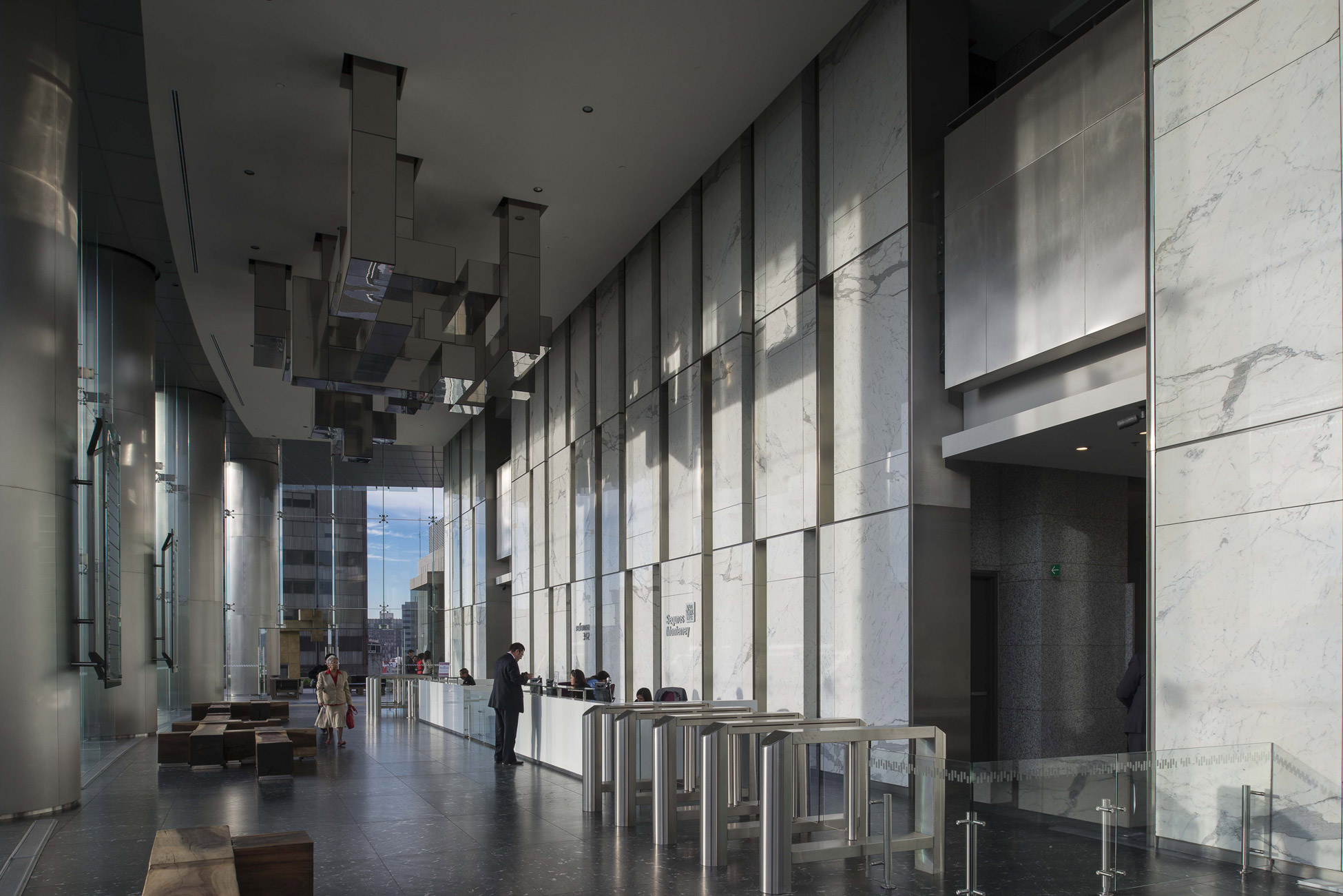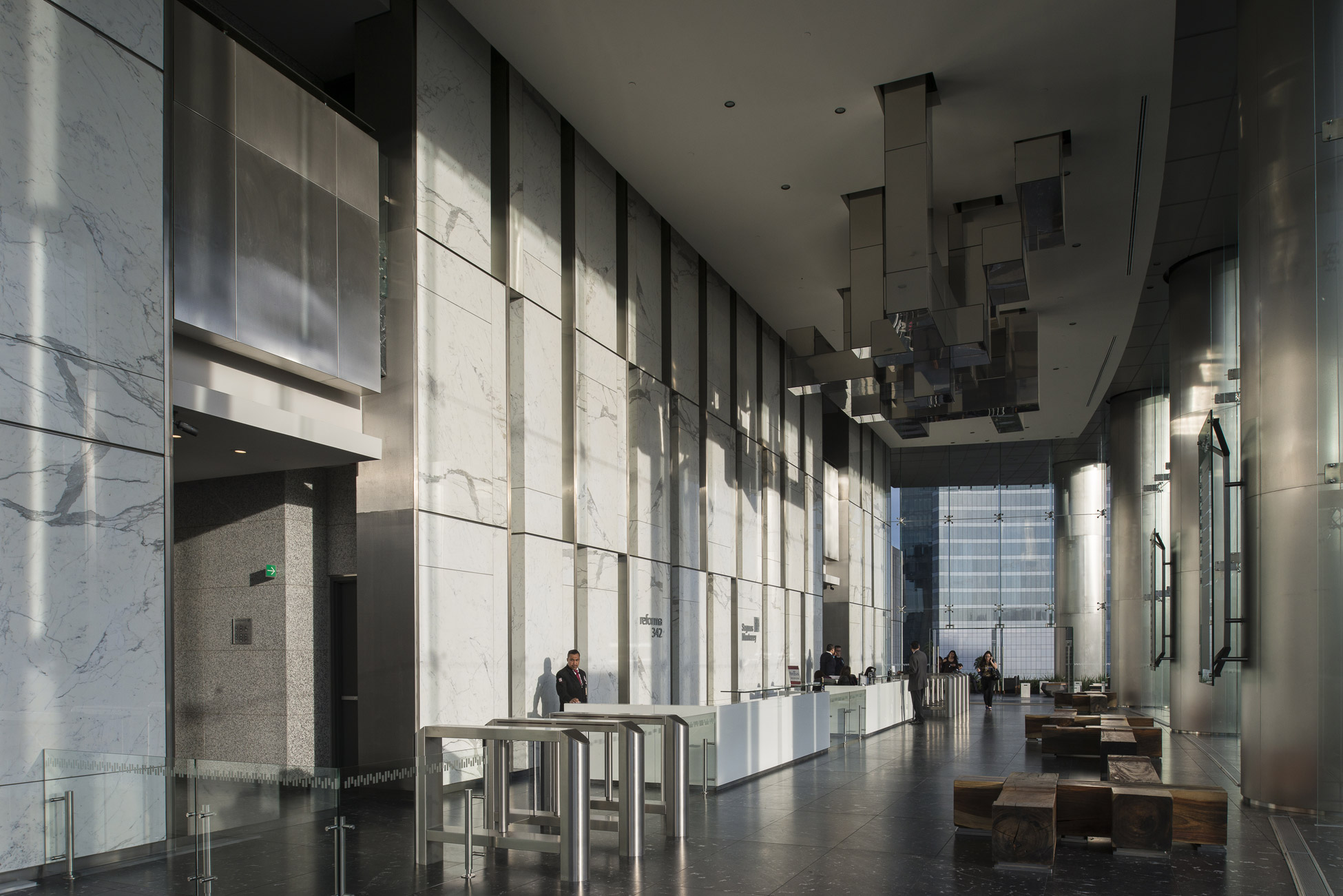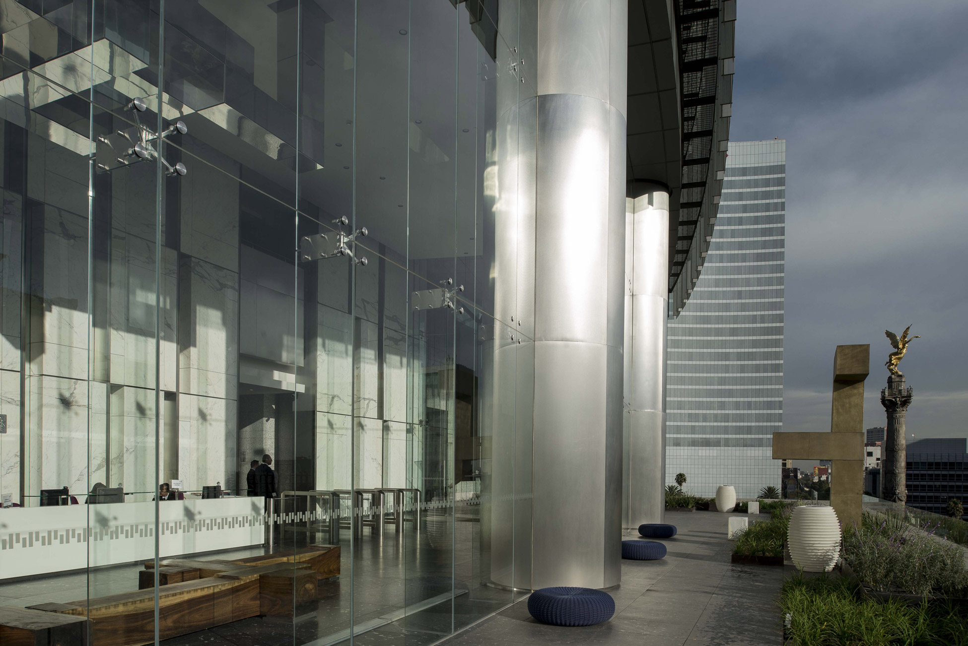 The main lobby is located upon the top of the trees of Paseo de la Reforma and Florencia street, at the 7th level, enabling a close-up view of the angel.