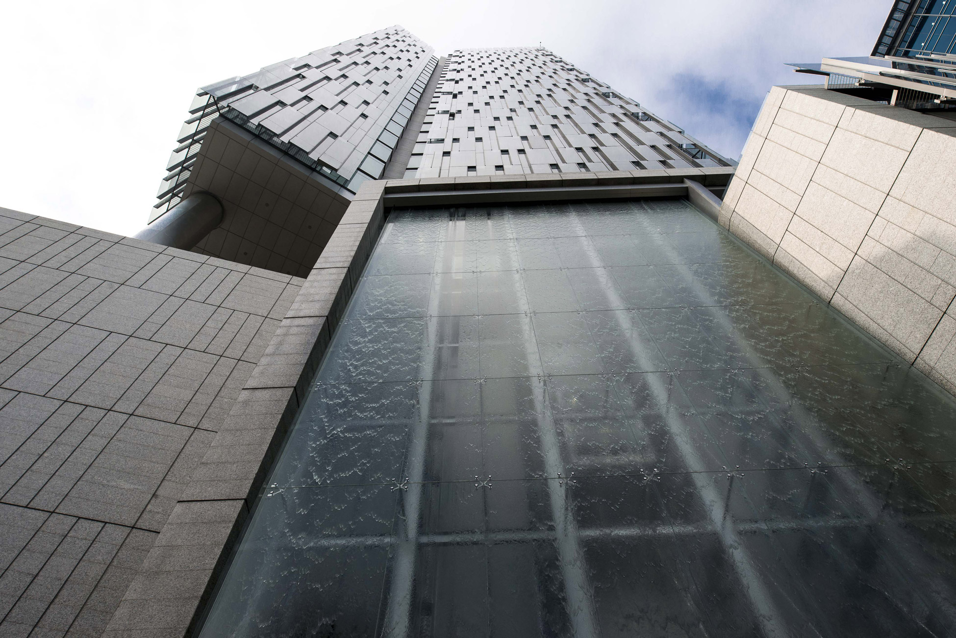 The access to the sky lobby is made through panoramic elevators under a 30m high water curtain which acts as a filter that refreshes and transforms the impressive view of the monument as the users travel along the reception area.