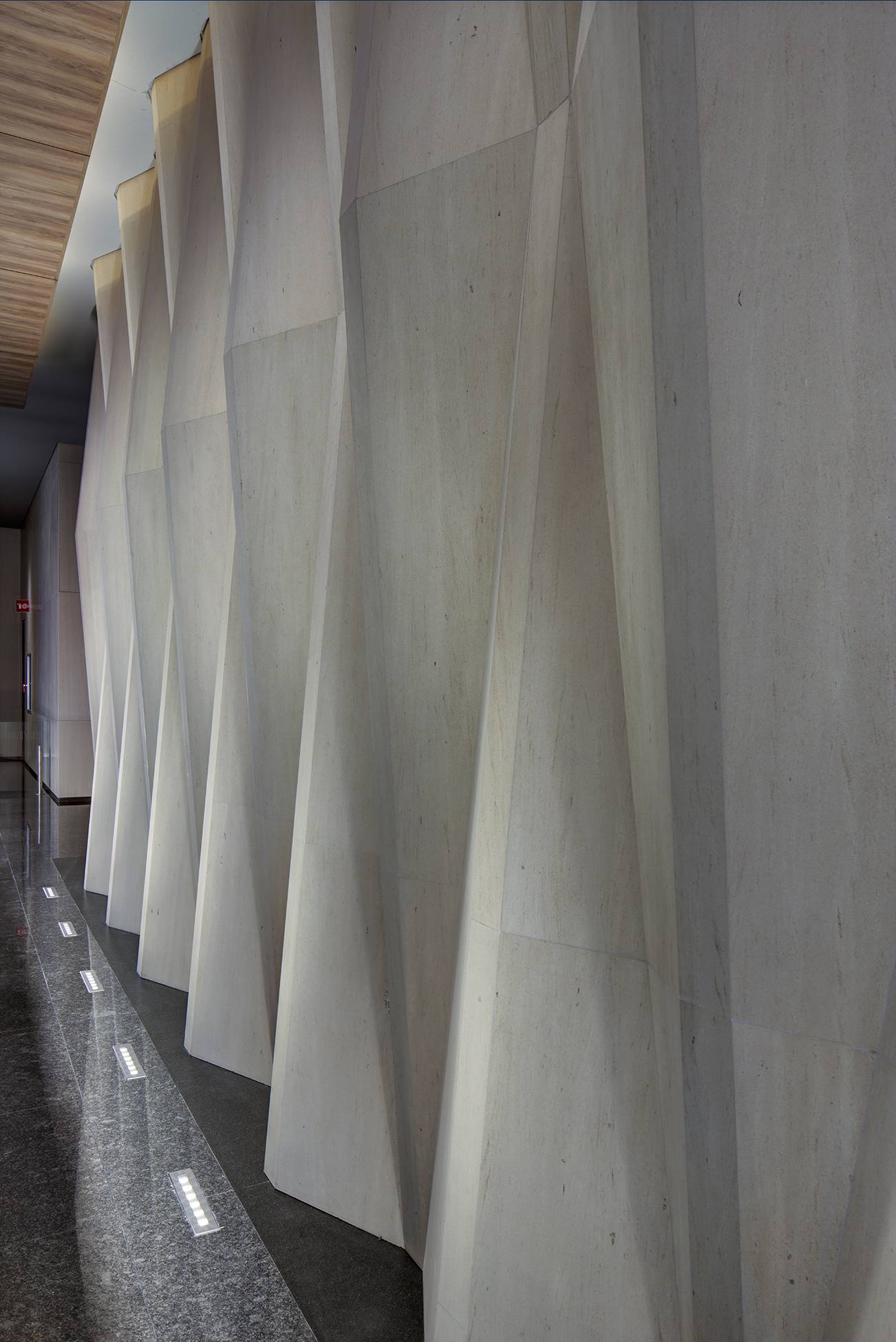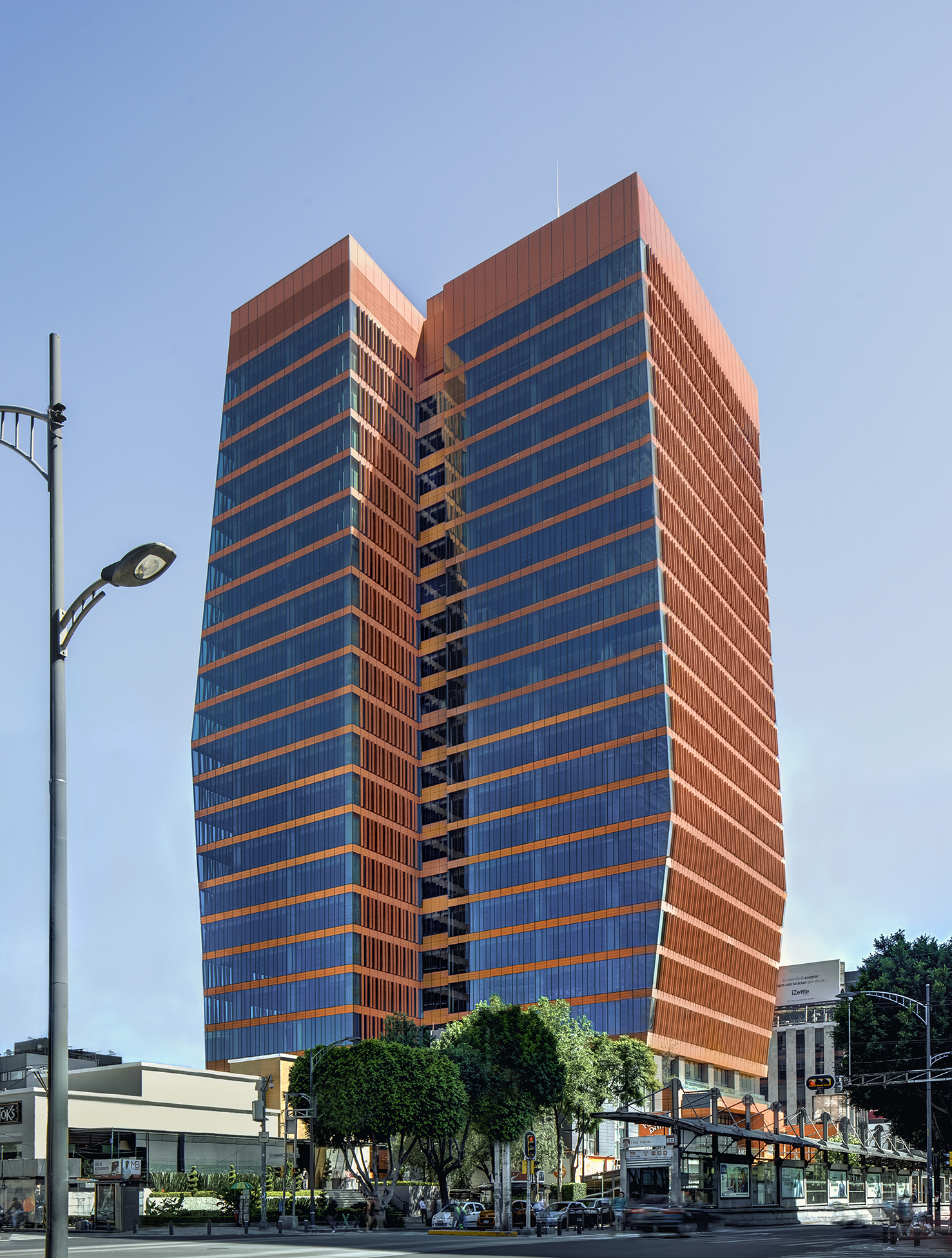 Dada la configuración del terreno, y con el objetivo de aprovechar al máximo su potencial, la planta se configura a partir de una geometría irregular, compuesta por dos polígonos rectangulares conectados transversalmente por un núcleo compacto, la cual da origen a una volumetría dinámica logrando la apariencia de dos cuerpos, de dos volúmenes que se intersectan. Además, como estrategia para optimizar el potencial del predio, se realiza un quiebre sobre la vertical de las fachadas predominantes en las caras oriente y poniente de la torre, logrando mayor esbeltez, mismas que están revestidas de parteluces verticales de terracota, mejorando las características energéticas del edificio y creando una textura fluida que ofrece una apariencia diferente según el punto de vista del espectador.