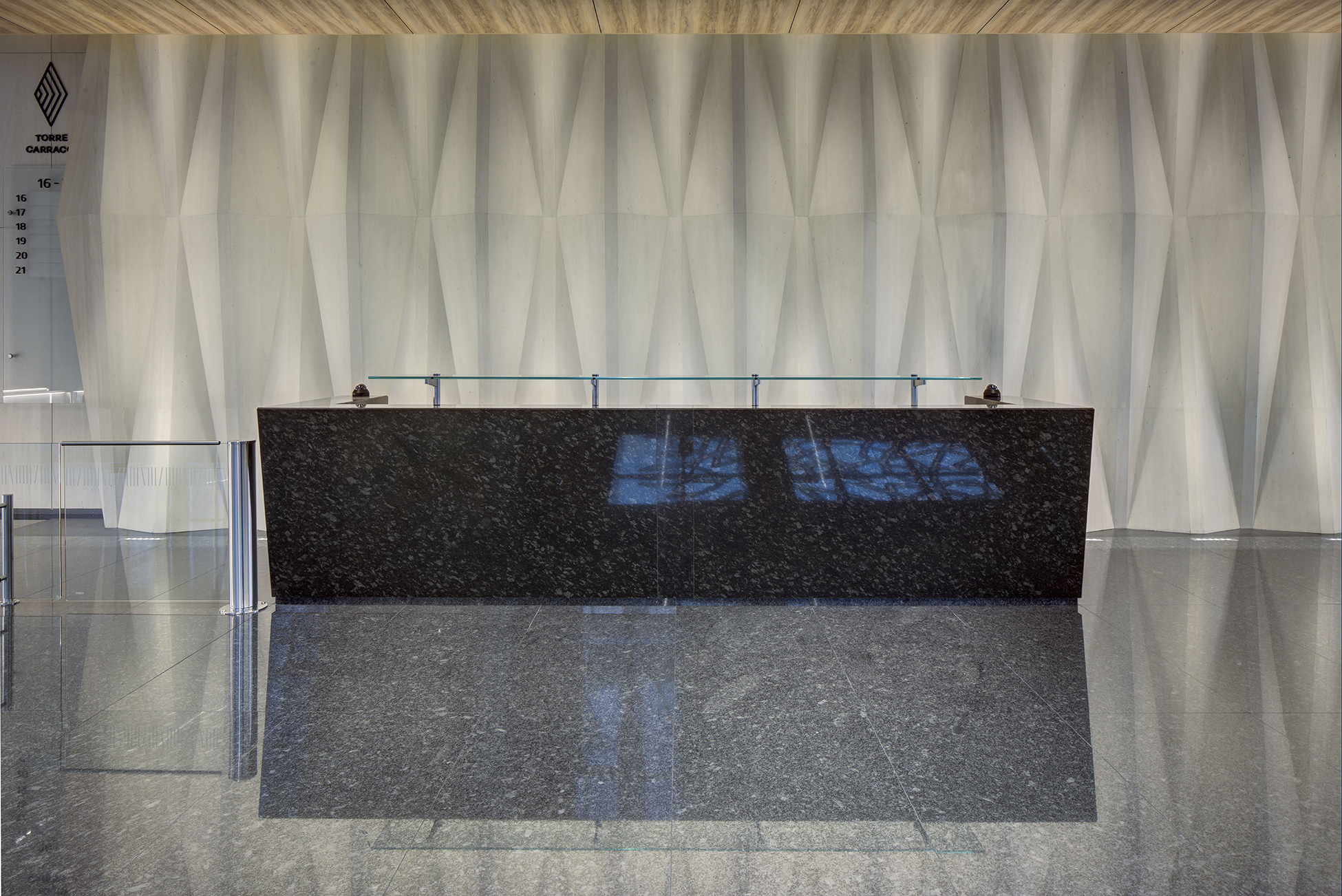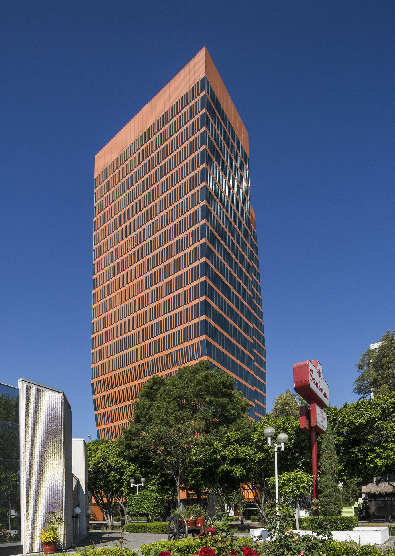 El edificio se desplanta sobre un basamento, en contacto directo con tres vialidades: Insurgentes Sur, y las calles Empresa y Carracci, logrando dar respuesta tanto a la gran avenida, uno de los ejes principales de la ciudad de México con un gran dinamismo, así como a las a las calles residenciales laterales, respetando la escala doméstica de la colonia Insurgentes Extremadura. El basamento está compuesto por dos niveles, destinados principalmente a comercio, manteniendo la vocación del corredor vial, con restaurantes, zona de comida y locales de servicio. En el tercer nivel aparece el sky lobby, acceso principal al corporativo y al primer nivel de oficinas, rodeado de terrazas y áreas ajardinadas, características del contexto donde se emplaza el conjunto.
